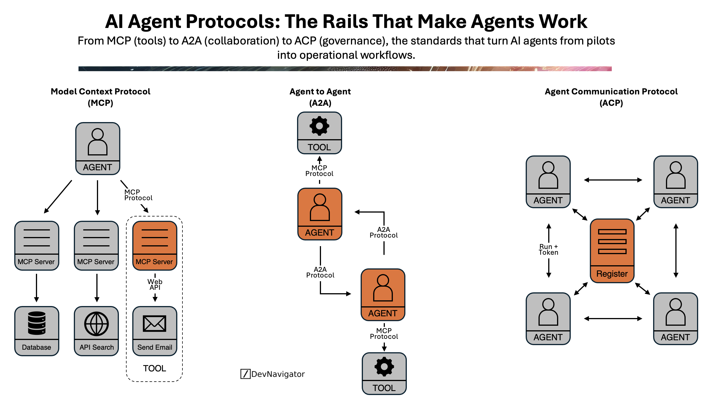 AI agents rely on shared communication standards to function reliably across tools, teams, and enterprises, much like software once relied on APIs and HTTP. The Model Context Protocol (MCP) enables agents to access tools such as databases, APIs, or messaging systems, standardizing how context and capabilities are shared. The Agent-to-Agent (A2A) protocol extends this by allowing agents to collaborate—delegating tasks, exchanging results, and coordinating reasoning chains. Finally, the Agent Communication Protocol (ACP) introduces governance, enabling agents to register, authenticate, and operate within managed ecosystems where interactions can be monitored and controlled. Together, these protocols form the operational “rails” for agentic AI: MCP powers capability, A2A enables cooperation, and ACP ensures accountability. The takeaway: the future of AI isn’t just about smarter agents—it’s about interoperable systems that can safely and effectively work together.
