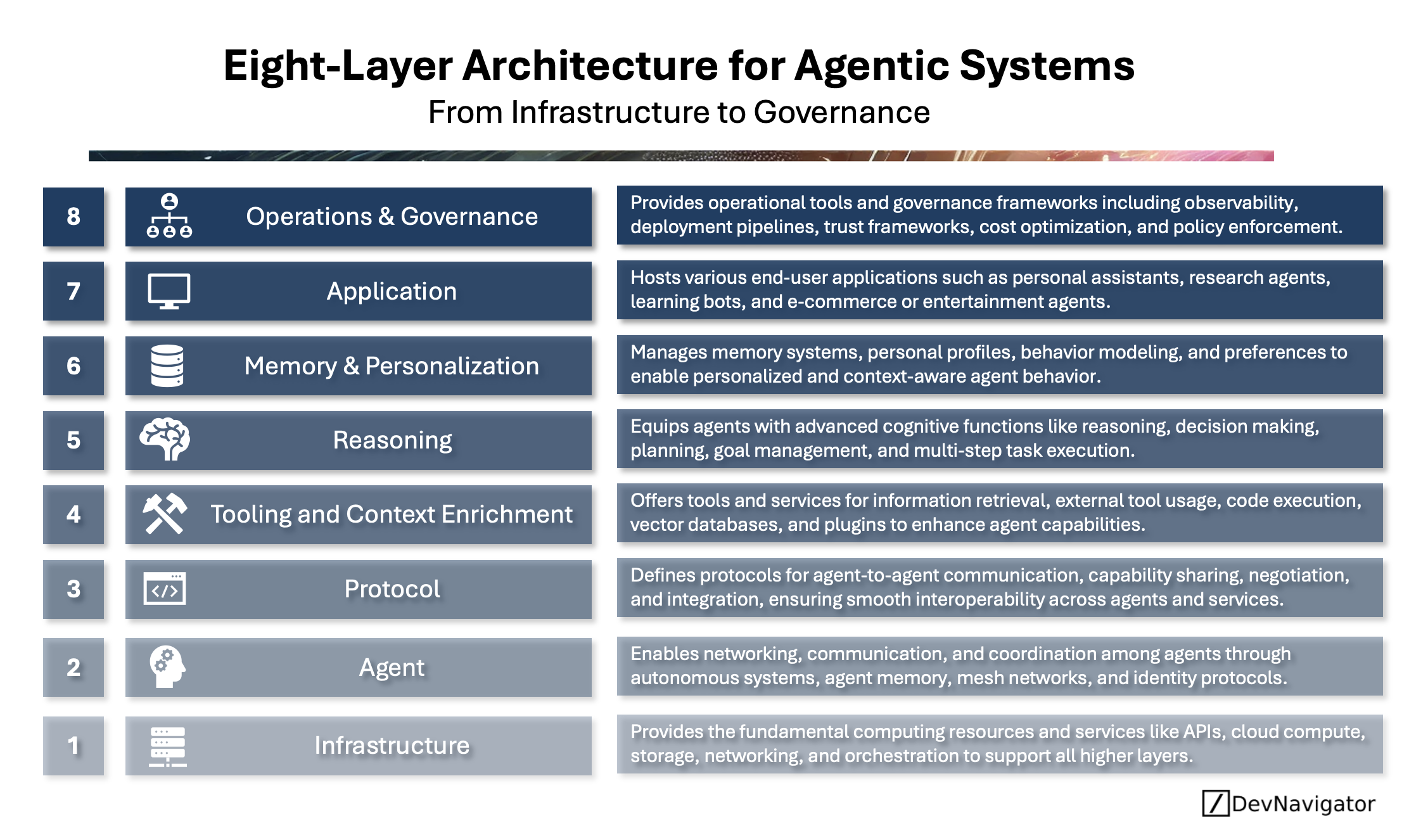 Building truly intelligent, autonomous systems requires more than powerful models, it demands a cohesive architecture that connects reasoning, memory, communication, and governance into a unified ecosystem. This eight-layer framework illustrates how agentic systems evolve from foundational infrastructure and protocol layers to high-level applications and governance mechanisms. Lower layers ensure stability and interoperability, enabling agents to access compute, communicate, and act reliably. The middle layers: reasoning, memory, and context enrichment, form the system’s cognitive core, allowing agents to plan, adapt, and personalize their behavior. At the top, applications deliver real-world value while operations and governance establish oversight, ethics, and accountability. The key takeaway: as AI systems become more autonomous, success will hinge not on raw intelligence alone, but on how effectively these eight layers are integrated to balance performance, trust, and control.